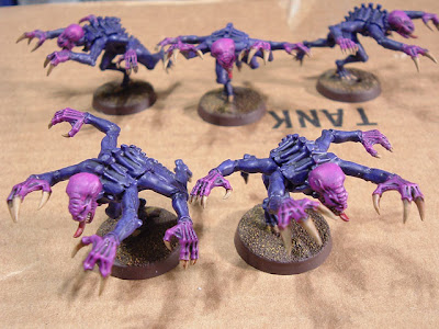 The reason the Genestealers are so easy to paint is because there are really only 3-4 areas of color, none of them are too fiddly to paint, and the colors used are easy to work with. The large amount of raised and inset surface detail on the figures also means they take washes and drybrushing very well, which speeds things up significantly.