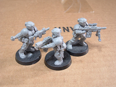 I found a Space Marine flamer, the front half of a Cadian flamer that was cut up to make the smartgun-style heavy stubber in Stupid Bitz Tricks #3, grenade launcher right arms, and some open-handed Cadian left arms. This is the result: