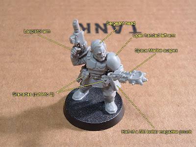 I kept the sergeant head because the Shouty Command Face expression and the headset make him look like a seasoned NCO firmly in charge of things. I also kept the laspistol arm, but used one of the open-handed left arms instead of the chainsword arm. I glued a Space Marine auspex into the open hand, which makes a pretty cool “motion tracker” device. Orienting his head in the general direction of the auspex makes him look like he’s barking out orders in response to the tactical picture on its screen.
