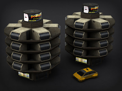 It’s a seedy capsule motel belonging to the Podtel 6 chain. There are 24 efficiency-sized pods, each with its own balcony, stacked in 4 rings of 6 pods. The rings aren’t glued on, they slip over the core structure like doughnuts on a stick. I imagine each pod is basically just a single open space containing an airplane-style bathroom, a small closet space, a nasty bed that probably hasn’t been changed in weeks, a really tiny table with burn marks on it, a couple of mismatched chairs, and a slightly dented flatscreen on the wall for watching overpriced softcore porn and so forth.